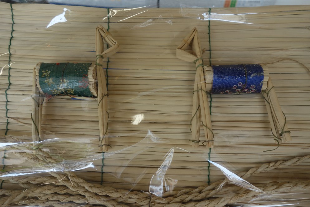A lively, gently spoken man, Takezaki is standing at the open door to his shop, Saraya, on the Tawaramachi intersection, explaining what’s in the makomo ancestor-spirit welcoming kit for O-bon, the three-day Buddhist feast of the dead that ends August 15. He says, There’s also this straw rope to string across the altar – or you can put up some hozuki Chinese lantern plants, that’s what they would have used before lanterns – and this straw mat you spread on the offering table and put out some dishes like these food samples, to give thanks, and then there are some sticks that you chop up and burn in a ceramic dish at your front door at the beginning and end, to welcome and send off your spirits.