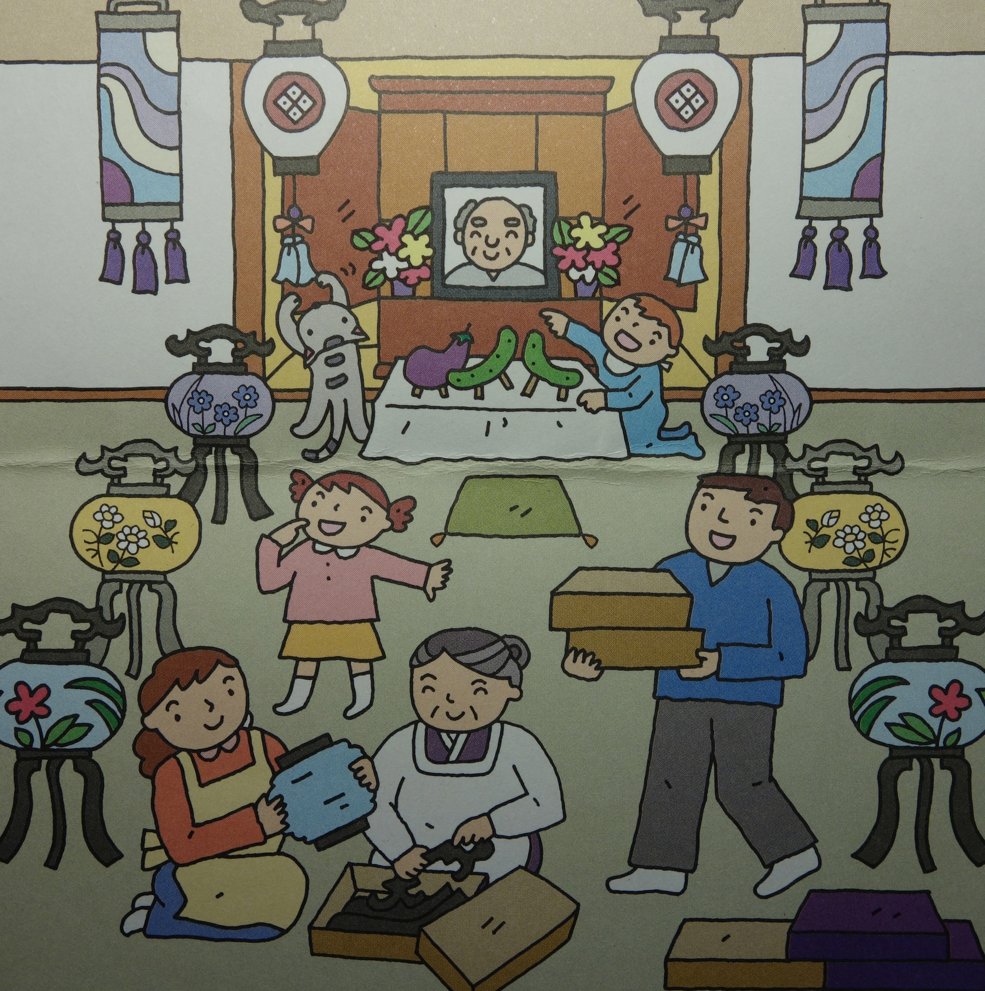 In two days Takezaki will put the lanterns away, and then take his own Bon holiday. For another year, Saraya will look like the dozens of Buddhist furniture stores lining Asakusa-dori from here to Inaricho, the next station on. As you leave he gives you a pamphlet, a single sheet that explains Bon “in 2 minutes” with colourful illustrations that make setting it up look a little like Christmas.