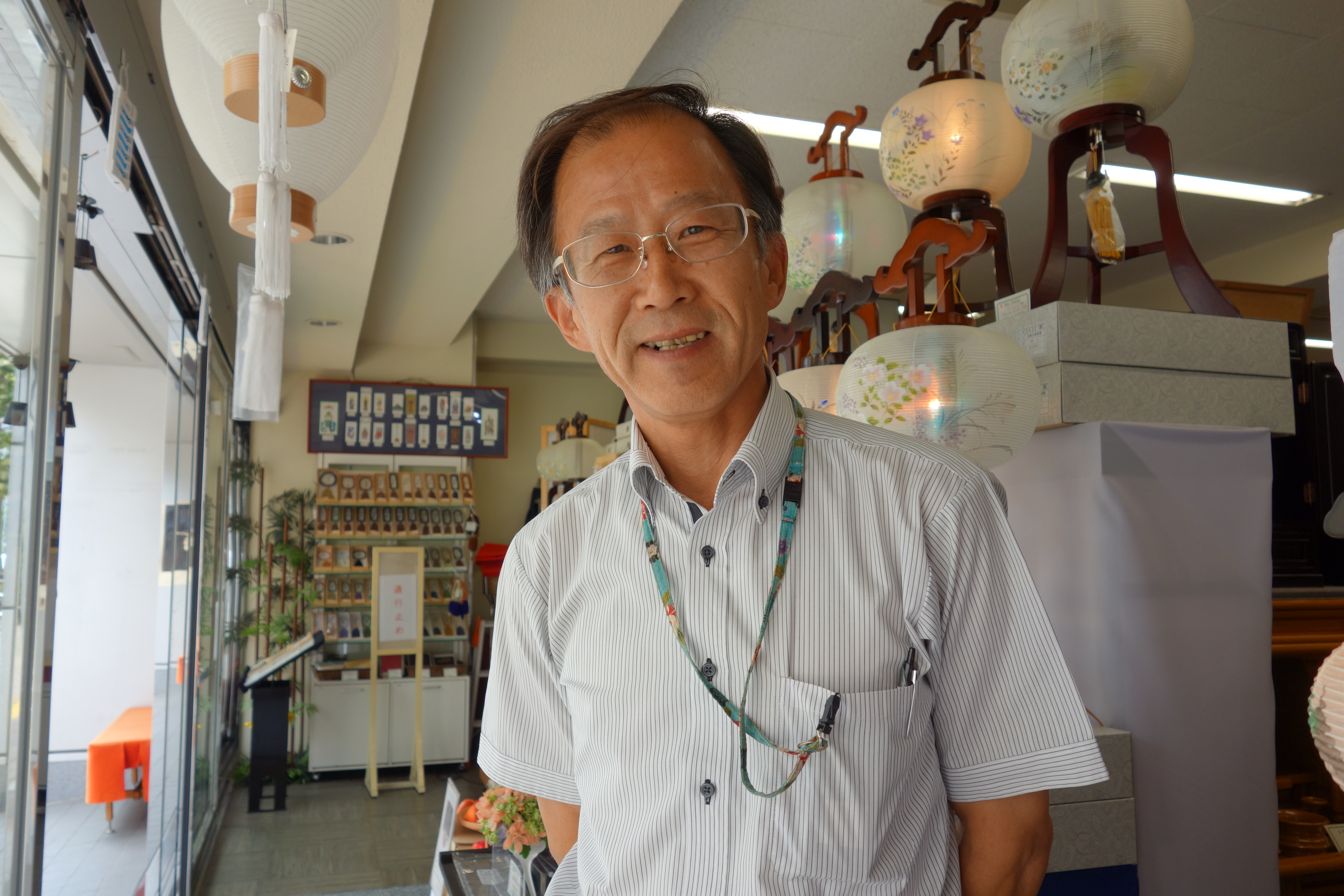 The brightest accessories are the Bon chochin lanterns, made in Gifu prefecture with lampshades of washi paper and silk. Some have blue and multi-coloured cylinders that balance on a needle tip above the lightbulb and spin from the heat, throwing cooling shadows on the walls. The craftsmen handpaint plant motifs. The flowers are ones that bloom in autumn. You won’t see summer flowers like morning glory, says Takezaki, they make you think of hot weather. The standard Bon lantern to position by the altar is the portable andon, about a metre tall. But Takezaki says the bestsellers now are the miniature ones. He says, People don’t have space, they think these small ones are cute.
