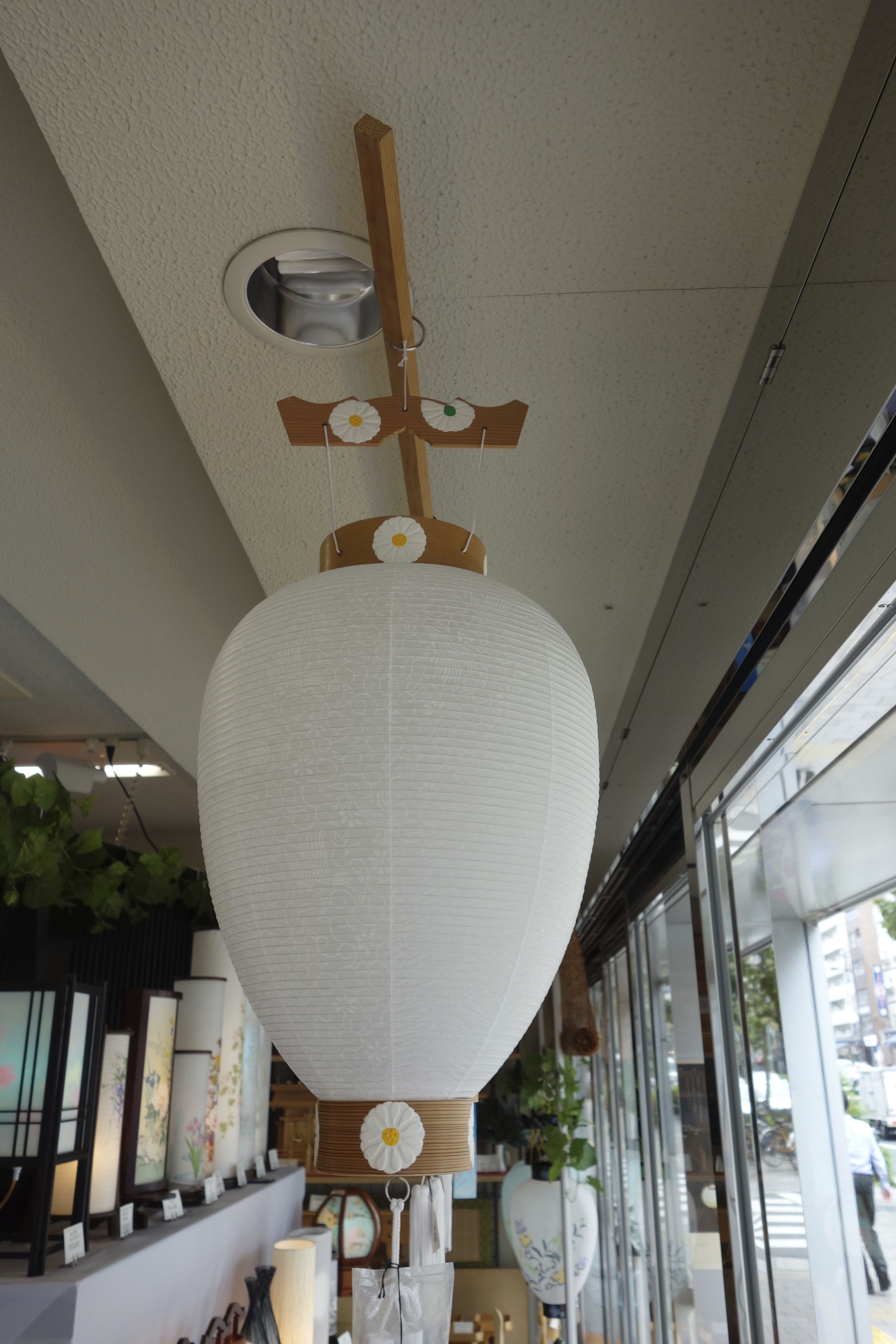 There are other lanterns too, plain white, free of motifs but with delicate patterns in the washi. They’re Nii Bon lanterns, says Takezaki, for spirits experiencing their first ever o-bon – for families with wounds still fresh. They’re only used once. The white seems to stand for a more intense absence.