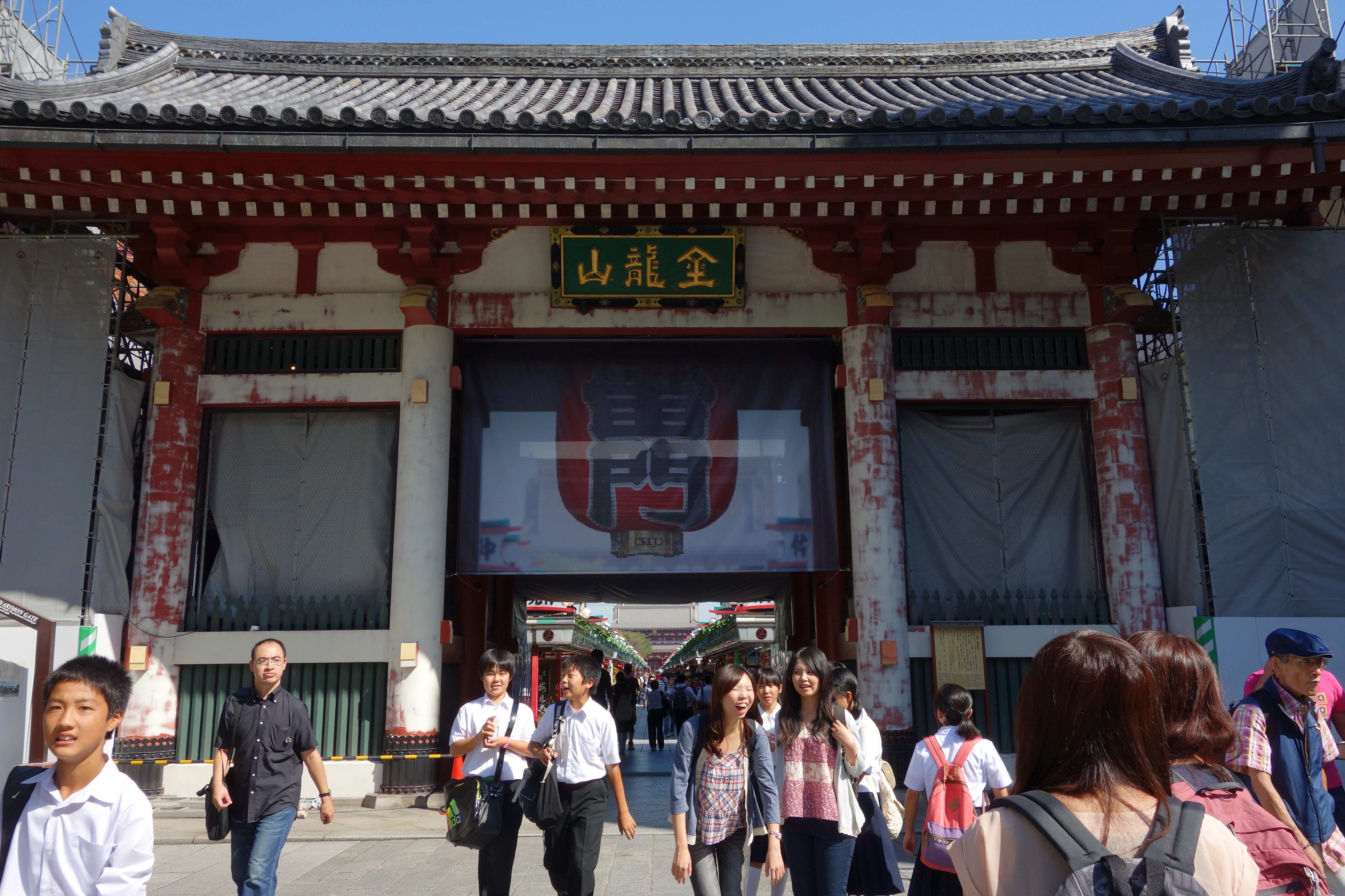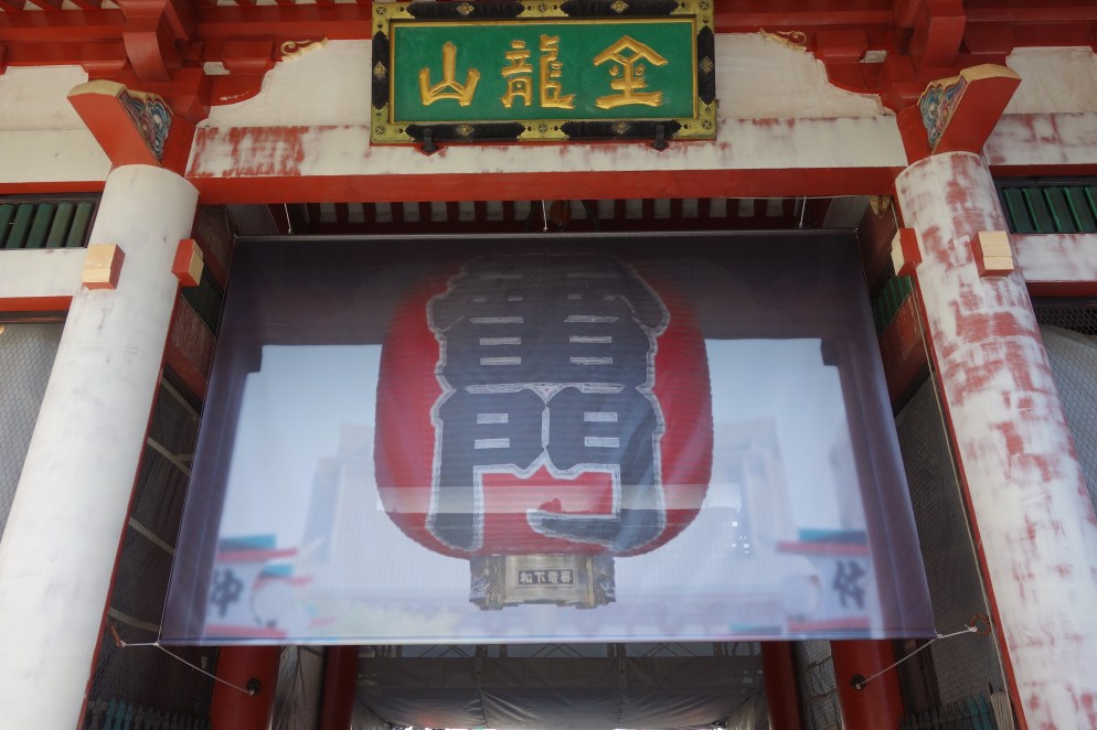 The keepers of Kaminarimon gate have removed from the fabled structure its massive 670-kilogram paper lantern. This is for 10-yearly renovations that continue until November. In its place they’ve hung a sort of roller blind showing a photograph of the big red light. It’s a bit of a low-budget affair – the somewhat blurry photo has been taken from a high angle and the background shops and temple have not been photoshopped out – but, who minds…