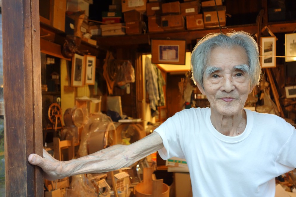 This is your second visit. You want to ask about some items he has in an exhibition near here, in Iriya. He says, I will get you a pamphlet. He steps off the platform into slippers and picks his way to the living room at the rear, around a clutter of intricately crafted model houses, shrines and boats, cuts of timber, unfinished works, tools and papers. The last time you visited, he said to you, I’m cleaning up, why don’t you come back in a week. Then he chatted for an hour.