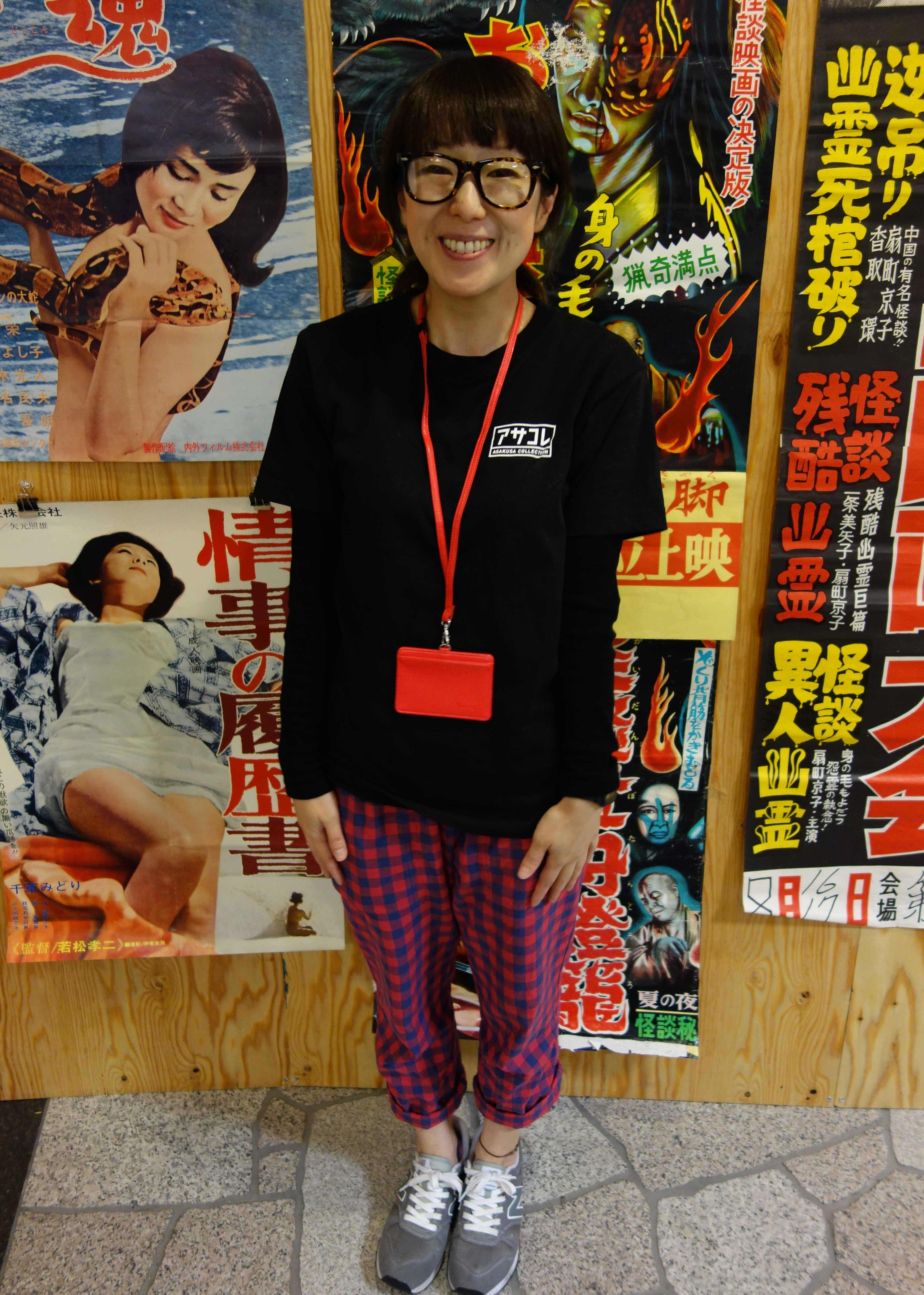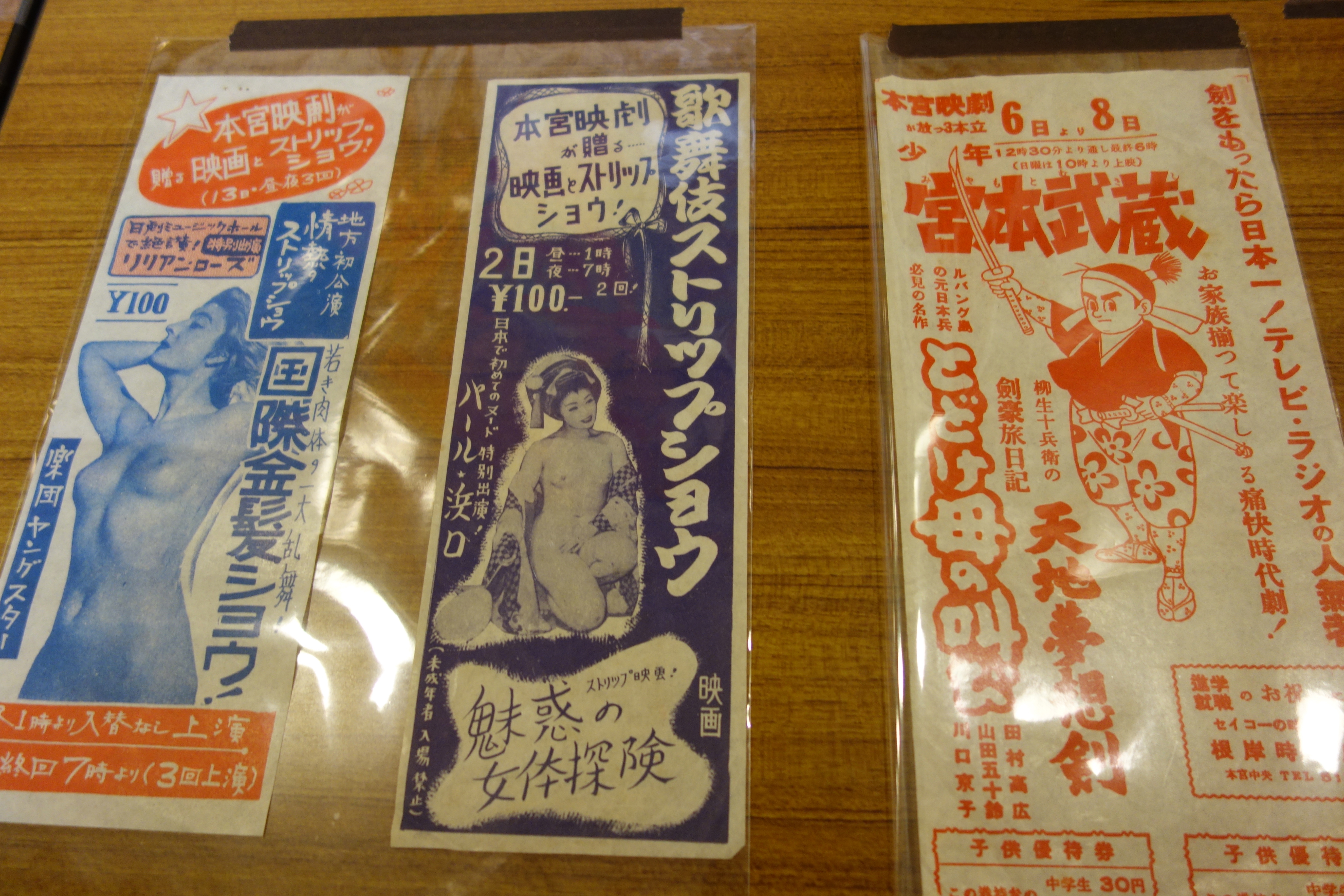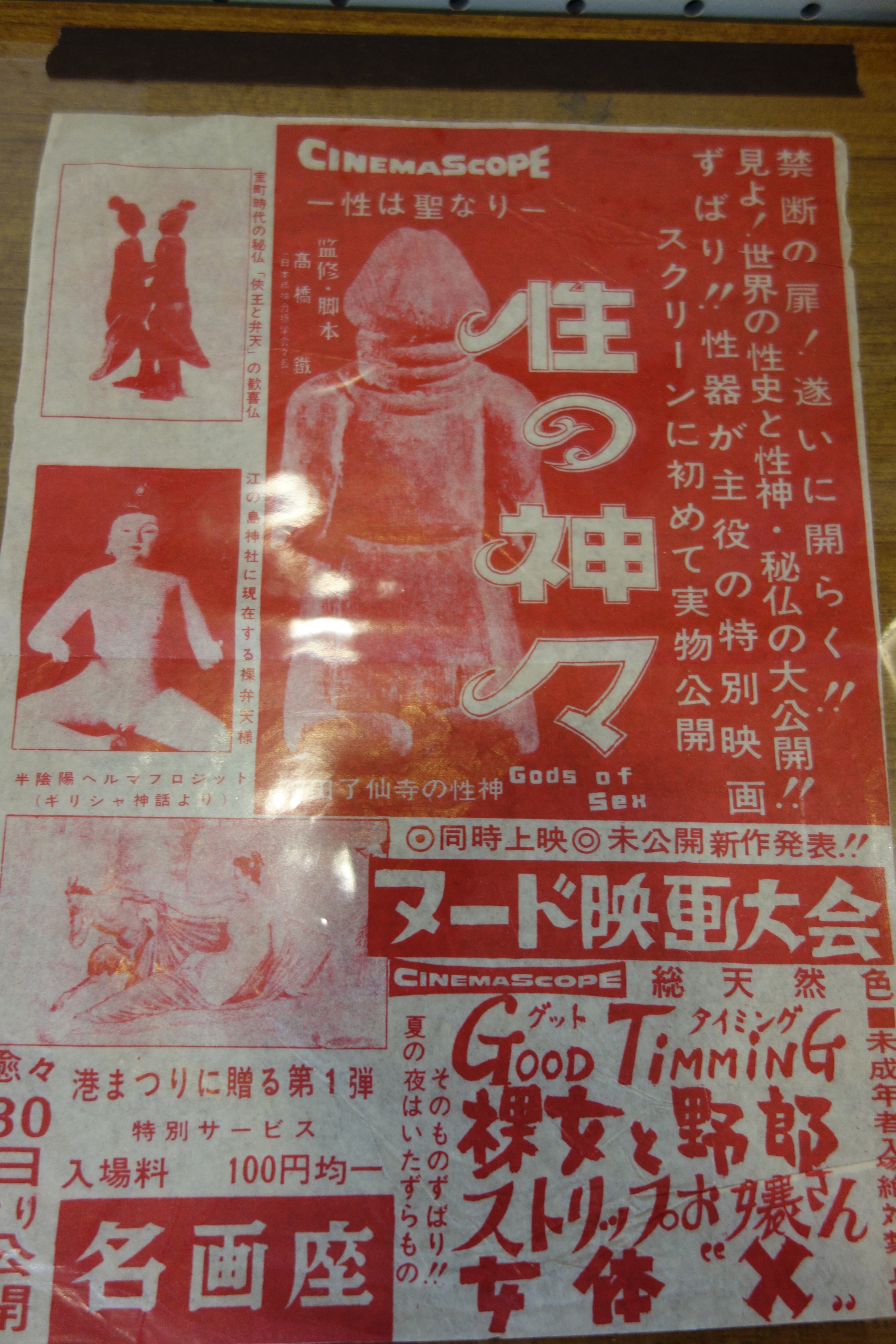 Some viewers wanted more of the rare circa 1960s movie mementoes brought down to Asakusa last month by the sparkly child of the century-old Motomiya Movie Theatre in Fukushima, Yuko Tamura. She said, Sure, this’s what dad got up to at home, to promote his movies. He’d sit at the table with scissors and glue and some horny magazines, cutting out the women and pasting up these fliers. It didn’t matter if the women were actually in the movies. He added the lettering and other elements, then took the paste-ups to the local printer who did them in two colours and had them inserted into the newspapers for home delivery.