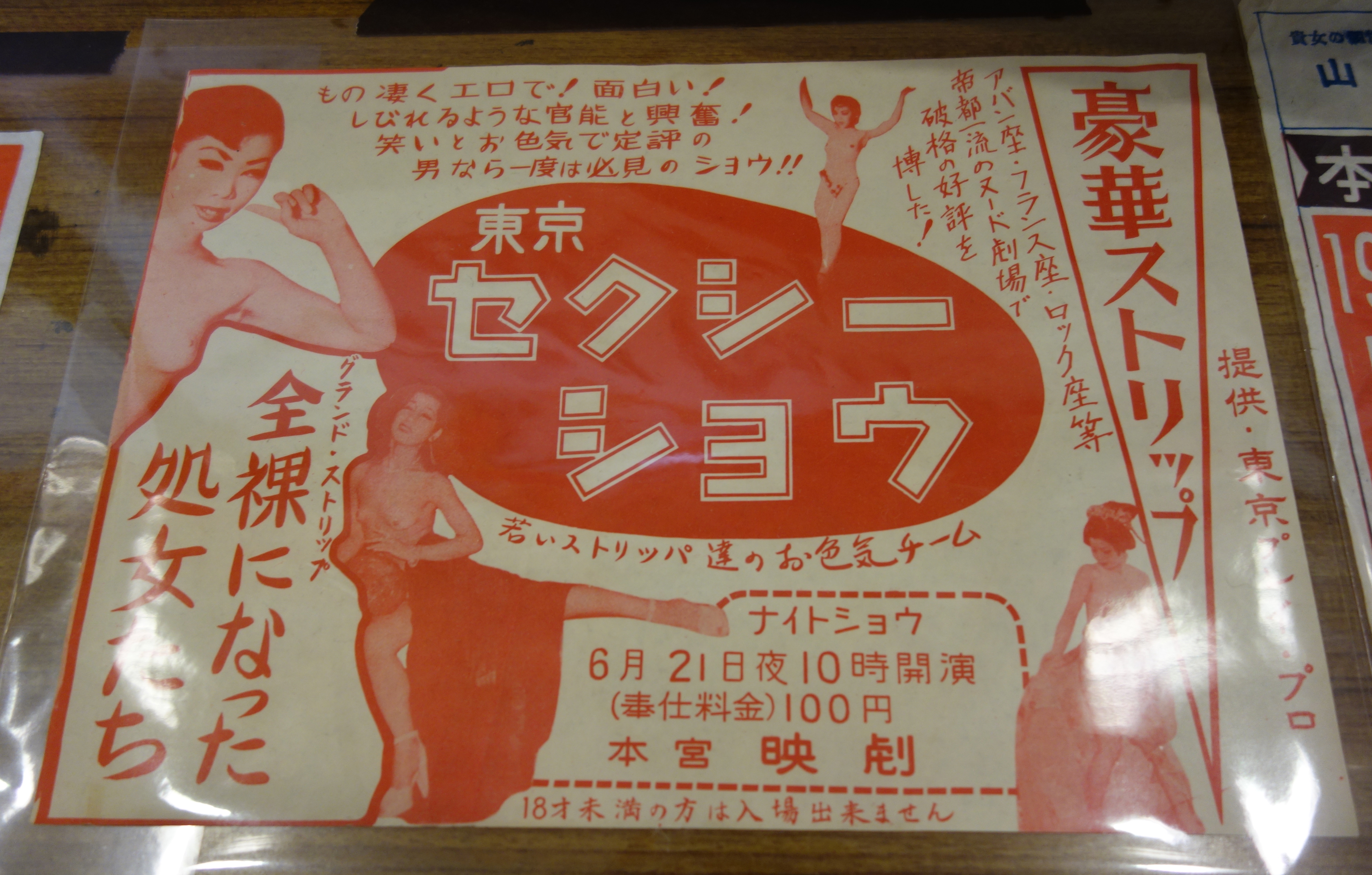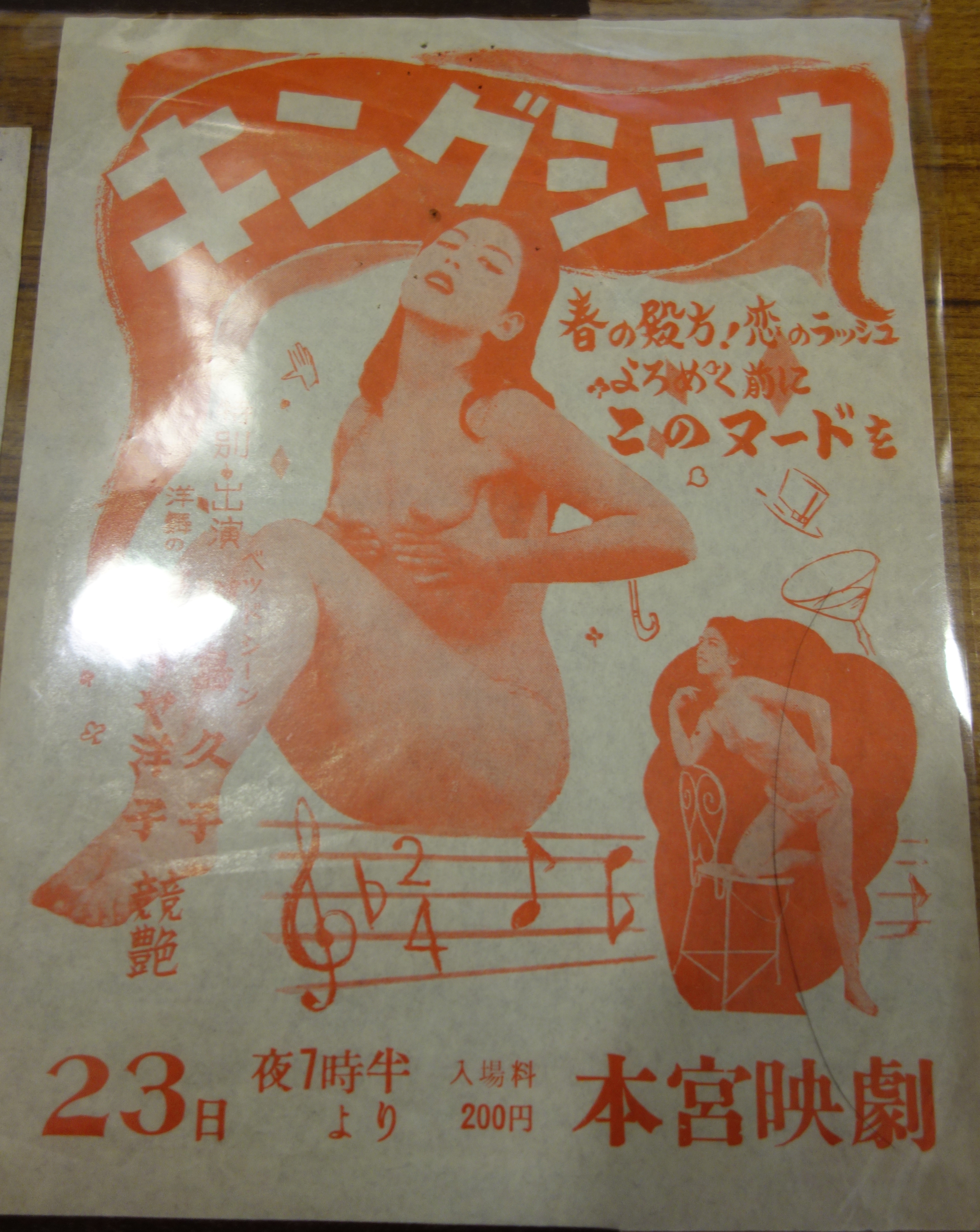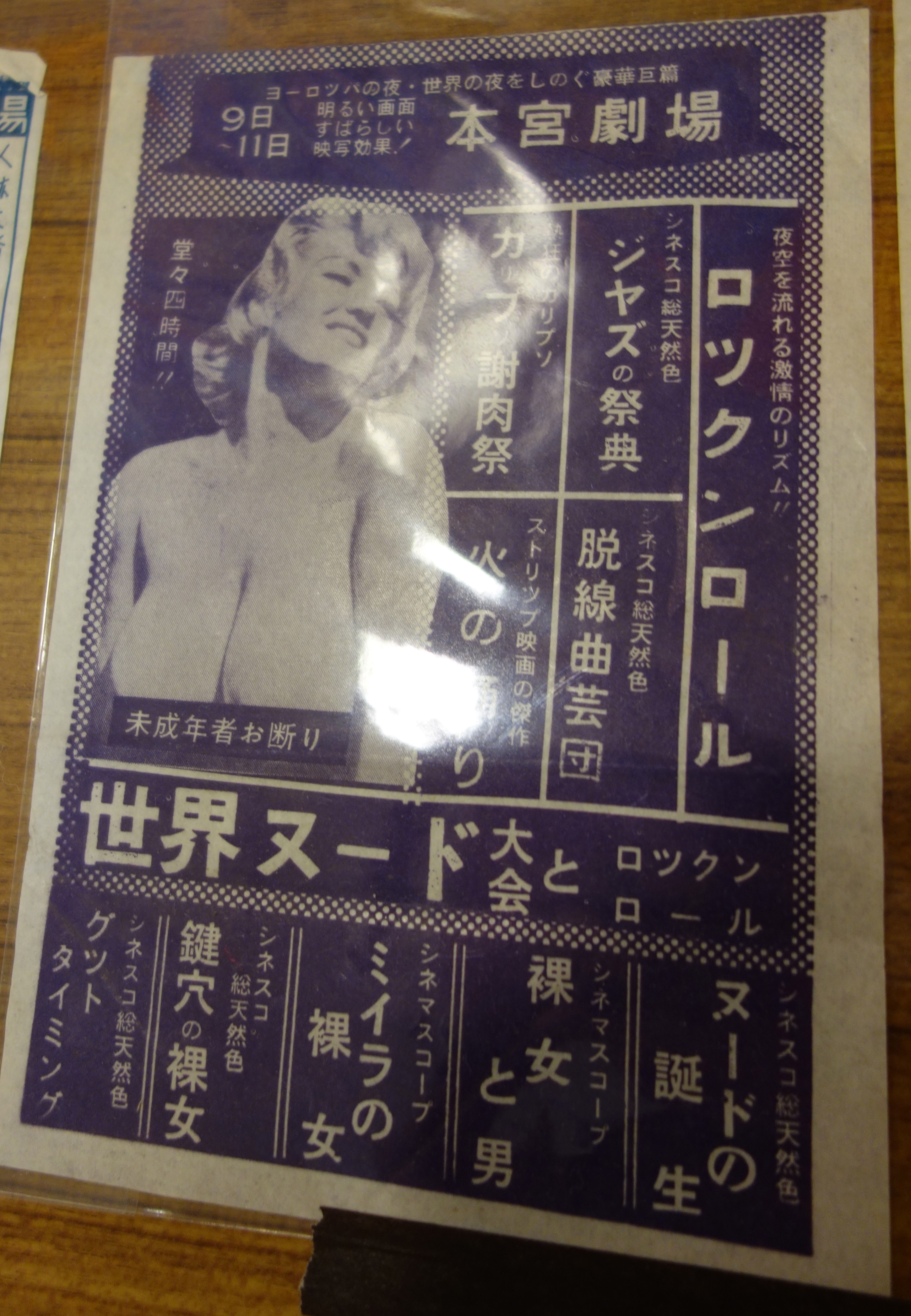 Home delivery??? World Nude Challenge and Rock ’n Roll; Kabuki Strip Show; International Blonde Hair Show; Gods of Sex. . . . It’s hard to believe these fell out of the morning editions for all the family to see, along with supermarket sales notices, but they are just part of Mr Tamura’s artistic achievements on the Tohoku frontier. His fliers didn’t push only soft porn screenings, but ghost movies too. Some promoted the double-headers he staged of ero-movies and strippers. Other live action extravaganzas included dwarf- and women’s- pro-wrestling, and shows by look-alike pop stars, or sokkuri-san.