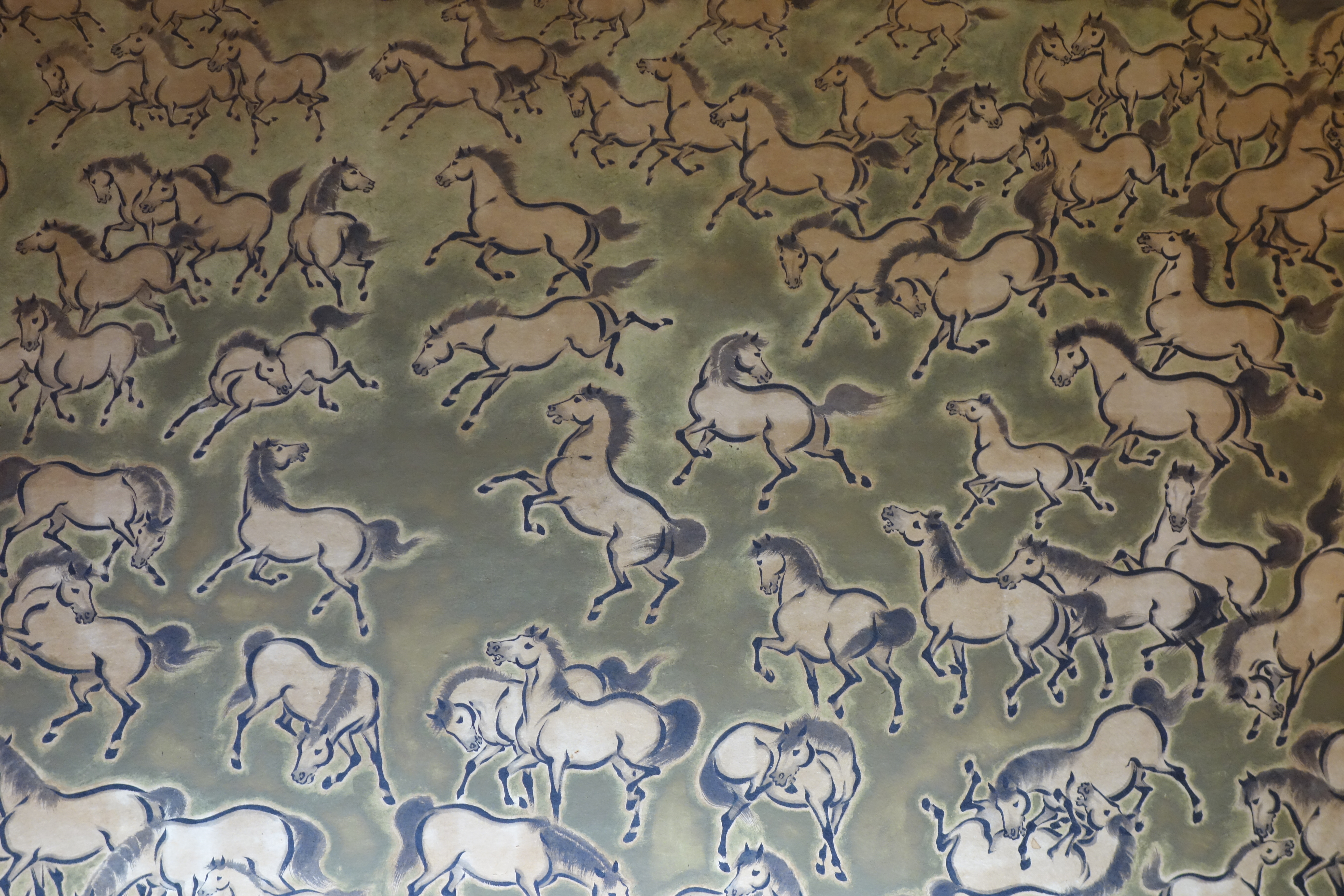 Inside the shrine is a clutter of horse ornaments, a mural-like painting of frolicking white horses, and a hundred pictures of samurai painted on the ceiling. You know Last Samurai, says the man, whose name is Ootaki, Tom Cruise? They studied these pictures before making the film. You ask how old they are. Oh not so old, he says. Maybe 80 years.