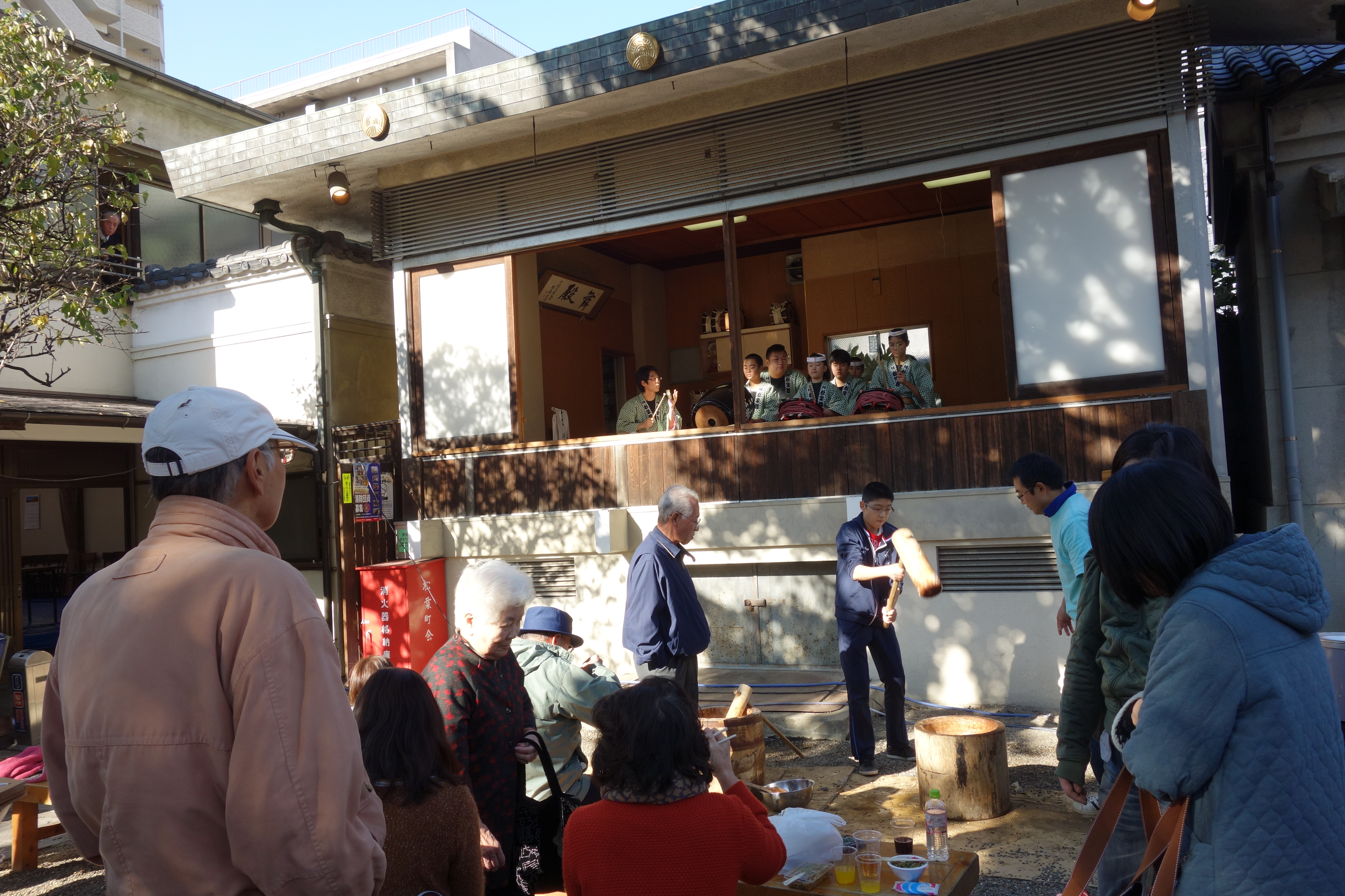 The little festival is in full swing, it’s this sound that pulled you down the sidestreet west toward Inaricho, as you bicycled up Kappabashi. Drums and flutes. Sometimes it’s hard to tell if distant drums and flutes are not perhaps coming from some lamppost-mounted loudspeakers, but these are the real thing, played by happi-coated kids in a raised, enclosed stage beside the shrine.