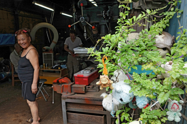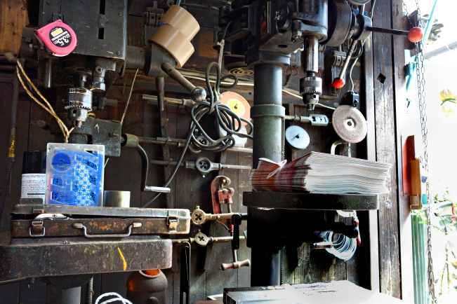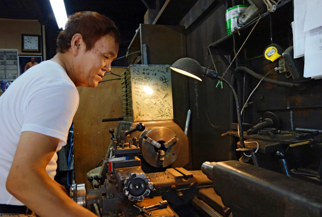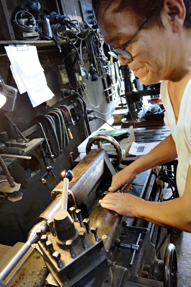 That day you are walking past and say hello and she said, to her husband, Invite that fellow in and chat to him. So Mr Kondo sits you down with a neighbour who has dropped by for a smoke, beside the curly air-conditioning hose amid the sweet smell of machine oil and metal shavings, and out comes a bottle of barley tea, and he tells you he makes tools to repair construction machinery, and he has been here for 50 years. Then he puts a piece of metal in the vintage lathe and shows you how he works. He has been for the past three decades, like his father before him, the operator of Kotobuki Seisakusho, Kotobuki Engineering, or Kotobuki Small Machining.