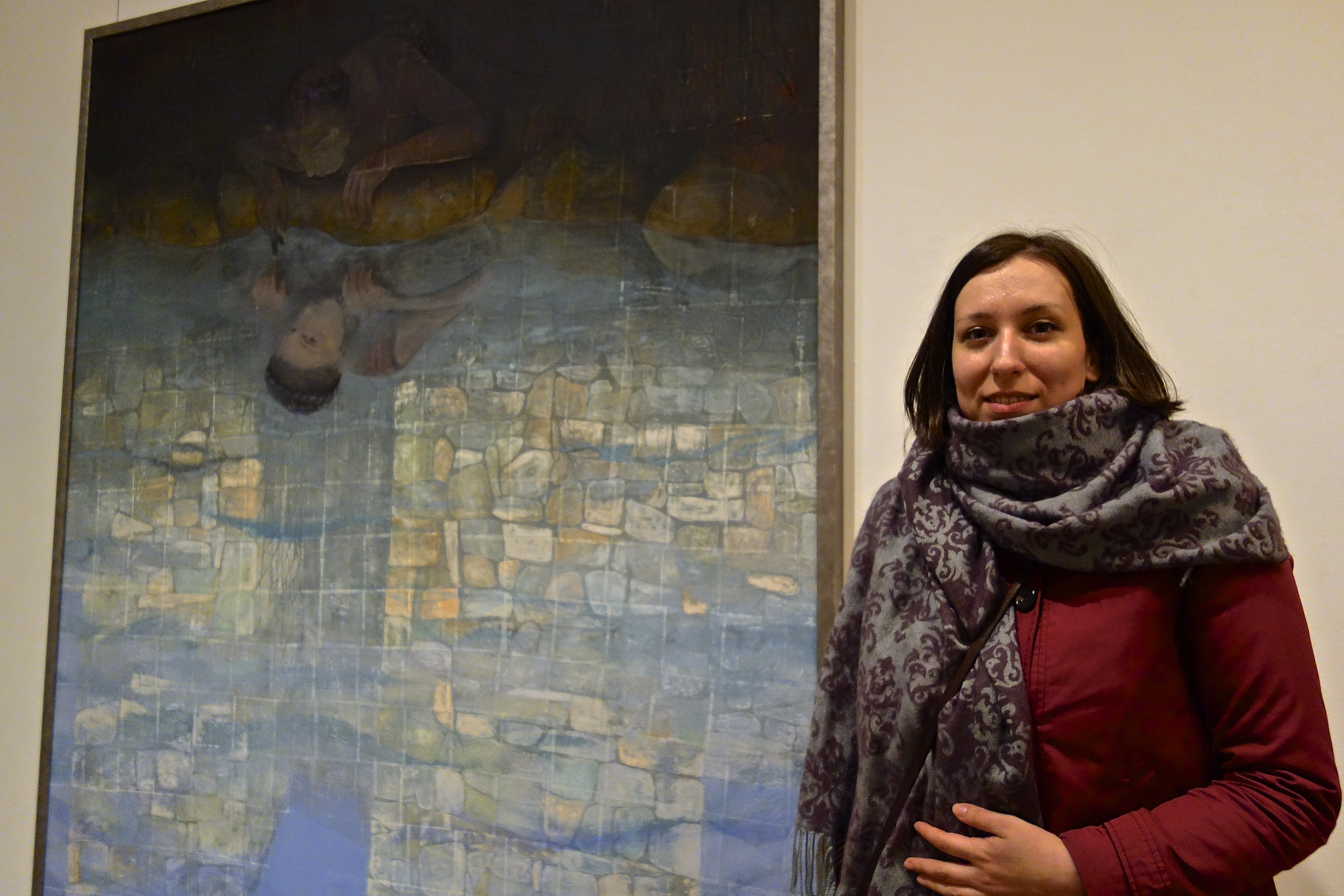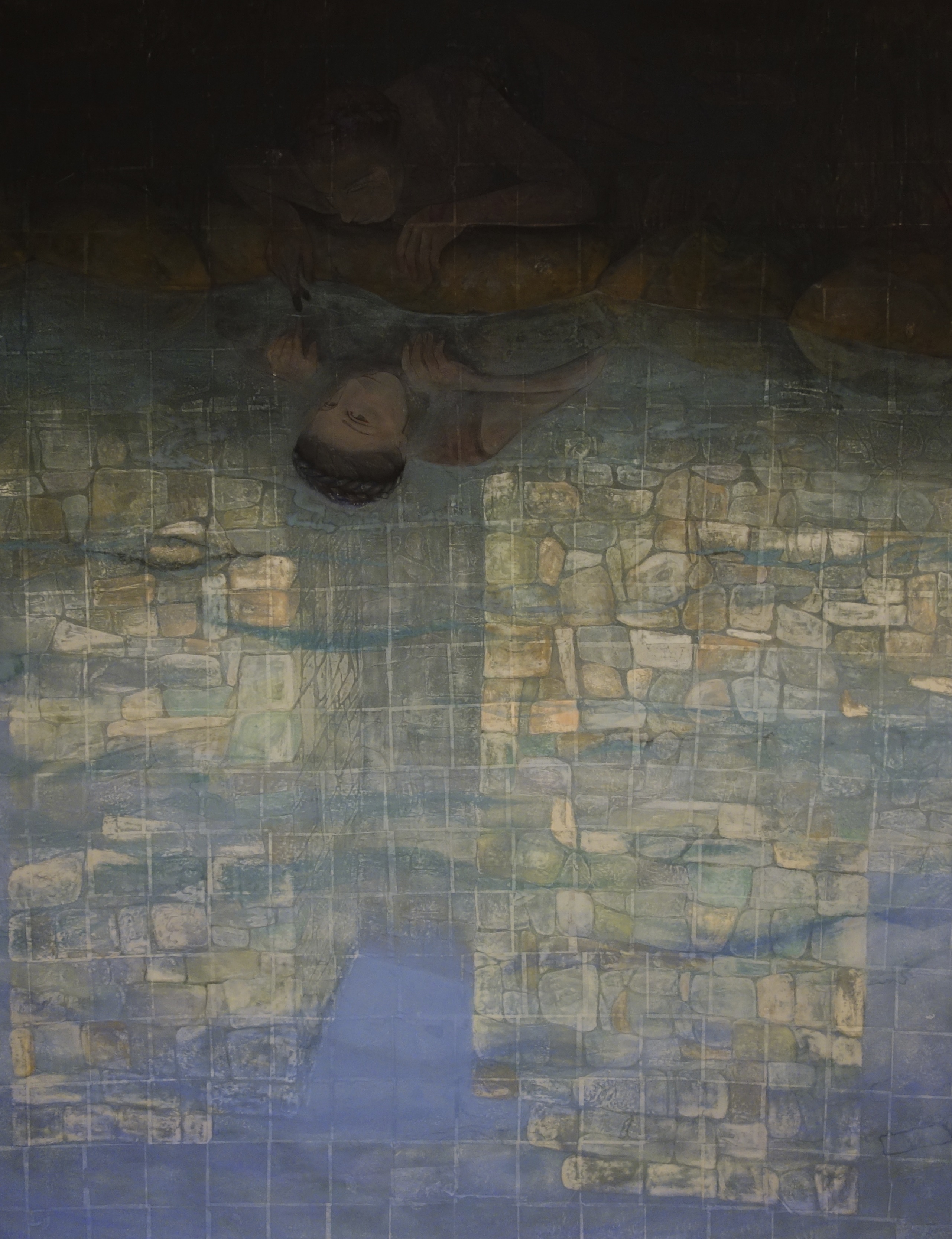 In the next gallery, past the exact facsimiles of decaying ancient scroll paintings, Marijana Anđelić tells you about An Unexpected Meeting. She is enrolled at one of the three schools of Nihon-ga, working with washi, mineral pigments, gold-and-silver leaf and other collage techniques. There’s a strong story element. The reflection is a little like her life in Japan, Marija says. Real and unreal, more real than real. You see what she means, in the way you’re being looked at by that woman who may be in the water. In places Marijana used coarser pigments in order to get that shimmer from the minerals. Her challenge now is to find homes for her work, temporary or otherwise, since in order to graduate she must produce 10 of around this size. She says, They’re not made for Japanese apartments.