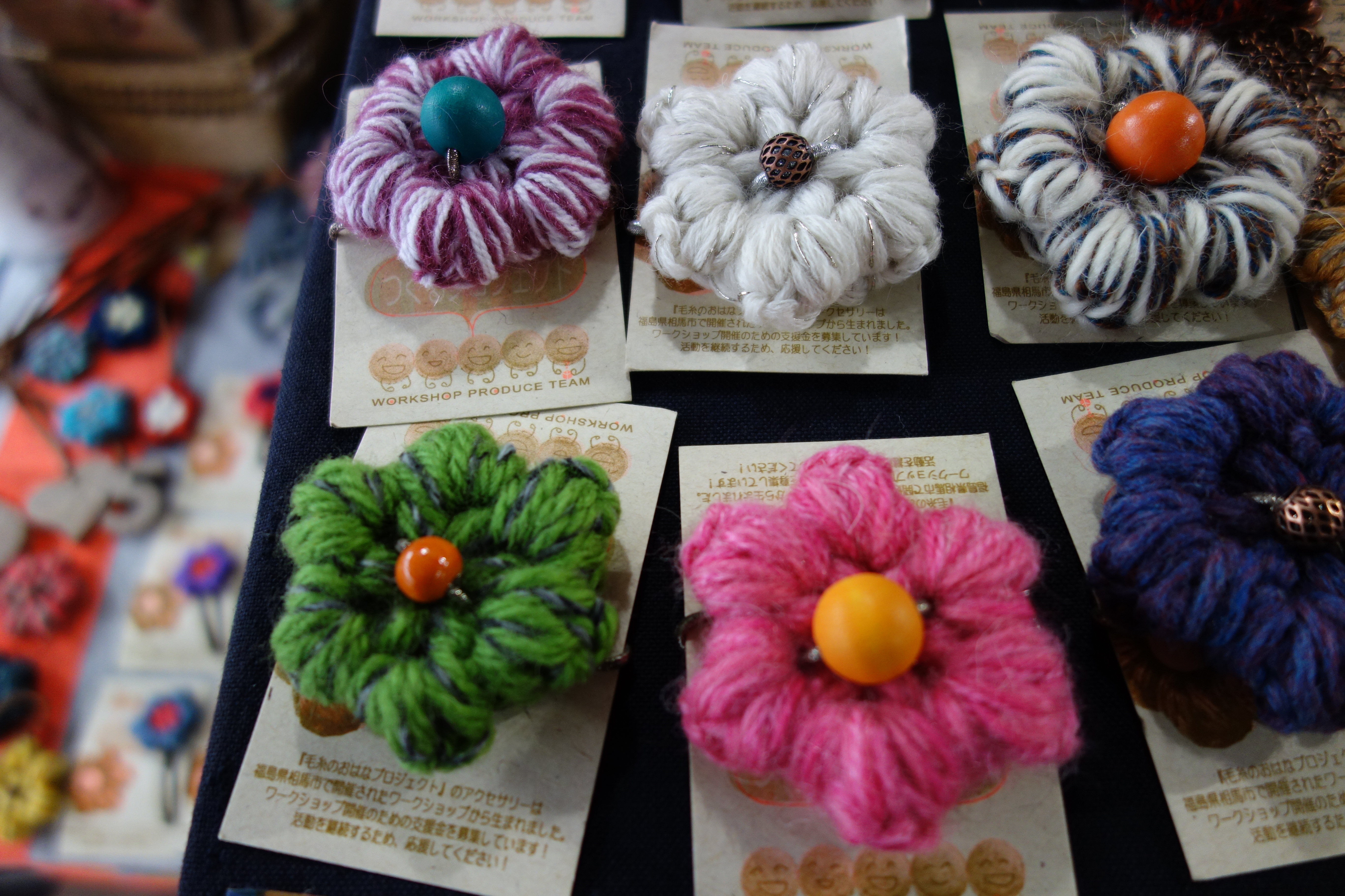 You look over a half-dozen stalls of mostly DIY crafts including one for a small Senju cafe called cup2gallery, and the Tsukuru Project of volunteer vendors selling accessories to benefit Fukushima and Miyagi. The woollen brooches are made in Fukushima from recycled yarn gathered in Tokyo.