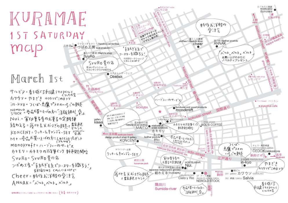 Begin March with a stroll…of Kuramae this First Saturday – you might find a bargain among the designer ceramics and accessories at Syuro‘s flea market, or the stalls at Designers Village, or the Spring-feel socks and fabrics at Salvia, and further down the river, genmai – brown rice – sweets and farmers’ produce at genmai izakaya Yuwaeru. Lots else – see map.
