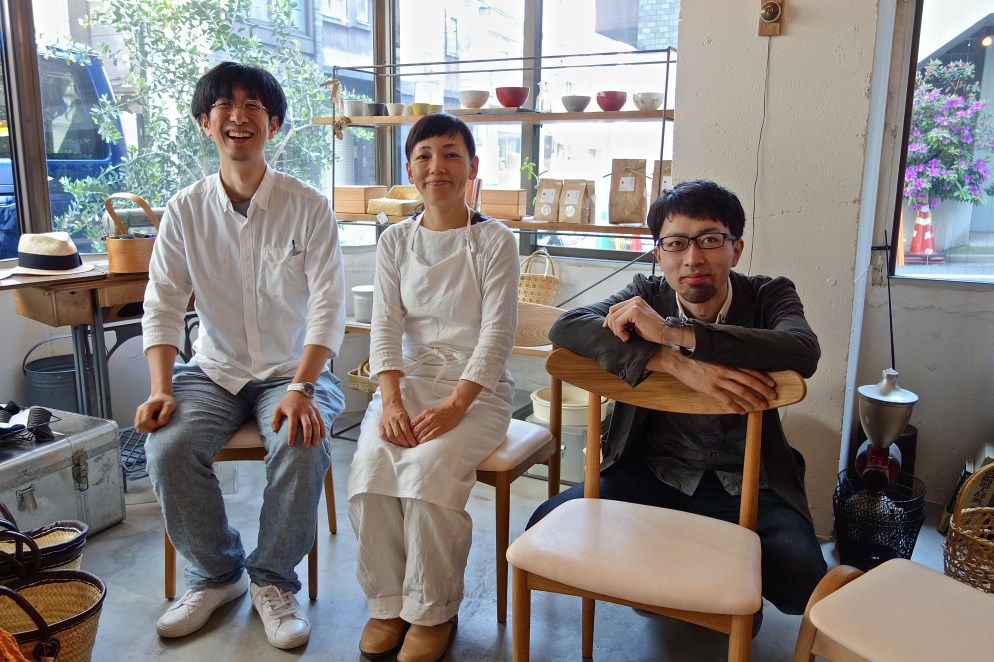 Every time you pop in to in-kyo recently there’s someone unexpected to interview. The other day it was a kitchen tools distributor, last week guitarist Hayato Aoki. You ought to tell store-owner Chie Nakagawa you’ll write about her! But today it’s these two fellows who have driven down from Fukushima to show Chie their new chairs, upholstered in locally sourced deerskin. The animals’ population has gotten out of hand and they’re being culled in the wild. For the first time the 85-year-old, Fukushima-based La Vida furniture company is using the leather in its chairs. This includes pieces by designer Dai Misaki (on Chie’s right), assisted by Daisuke Hasegawa (left). Other chairs include reupholstered vintage Stacking Stools – the iconic Showa-era design by Isamu Kenmochi.