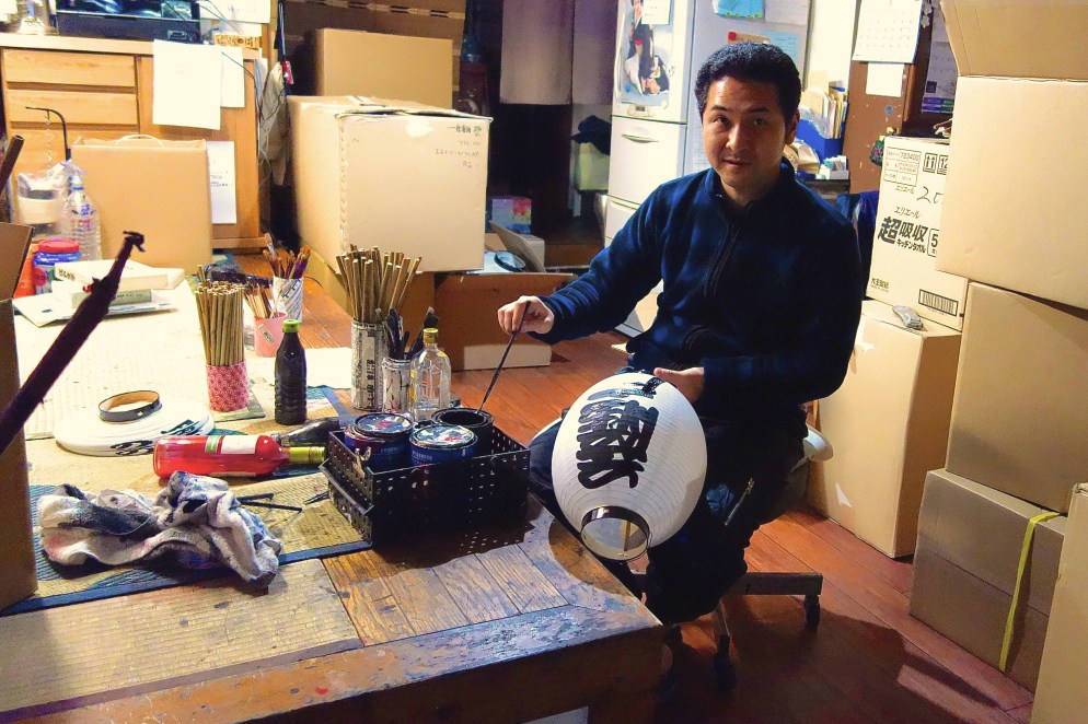 He gestures around. I painted about 800 lanterns in these cardboard boxes. They go up at Asakusa Jinja, next to Sensoji Temple.