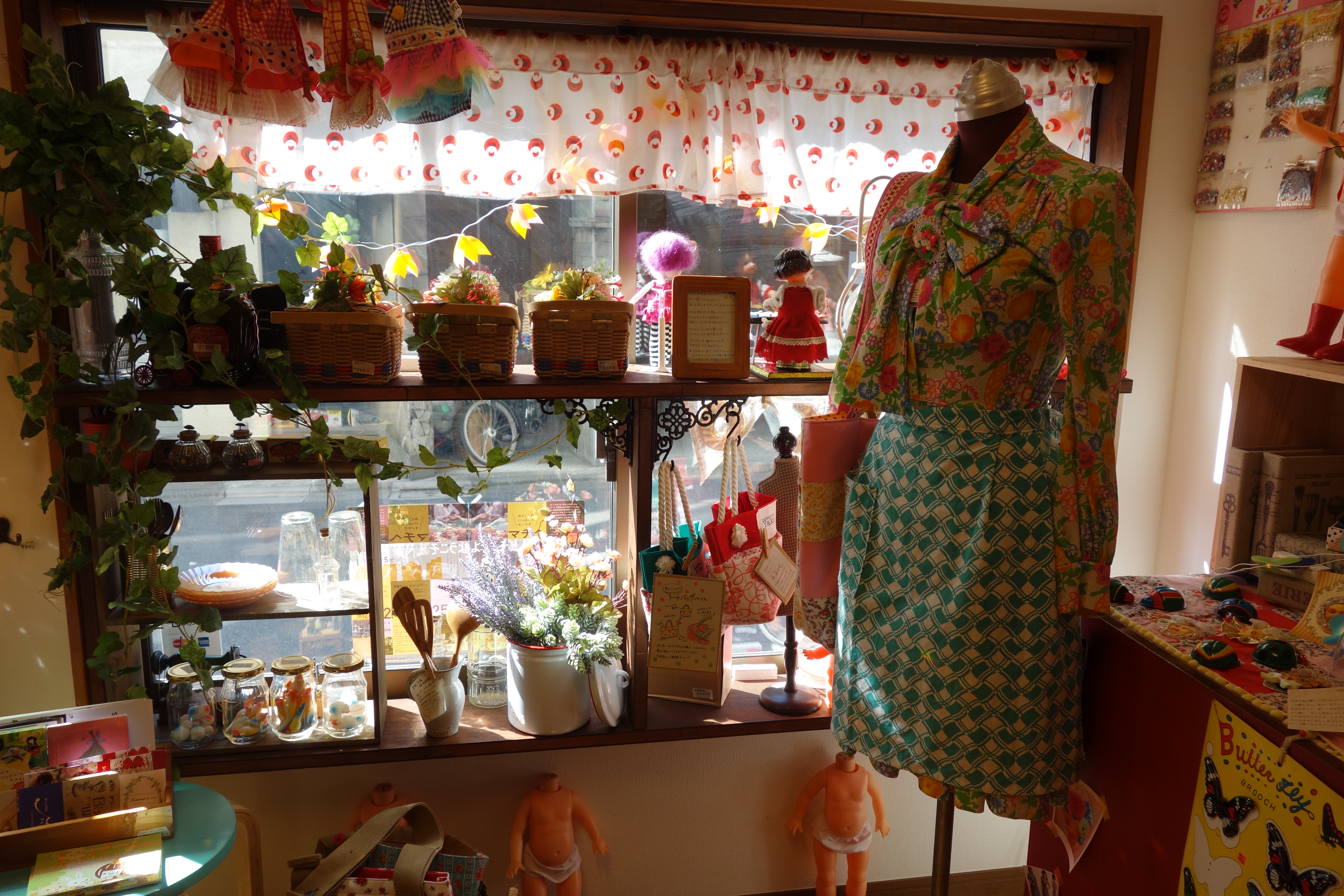 Her shop is a total world, you step in and it engulfs you, carries you somewhere, maybe to your childhood, maybe someone else’s, maybe one from a book, or a dream. At Mademoiselle Yako you can pick up a dead-stock pop gun or other vintage made-in-Japan toy, a candy-coloured necklace, an unauthorised 1964 Tokyo Olympic brooch, a soft-toy goldfish bowl, or one of her own handmade Petite-chan dolls, with handmade clothes and yarn hair and a permanently surprised expression. Sure they’re cute, like many of Yako’s things. But if they’re childlike, they’re somehow not childish. And if they look a bit knowing, they don’t seem contrived.