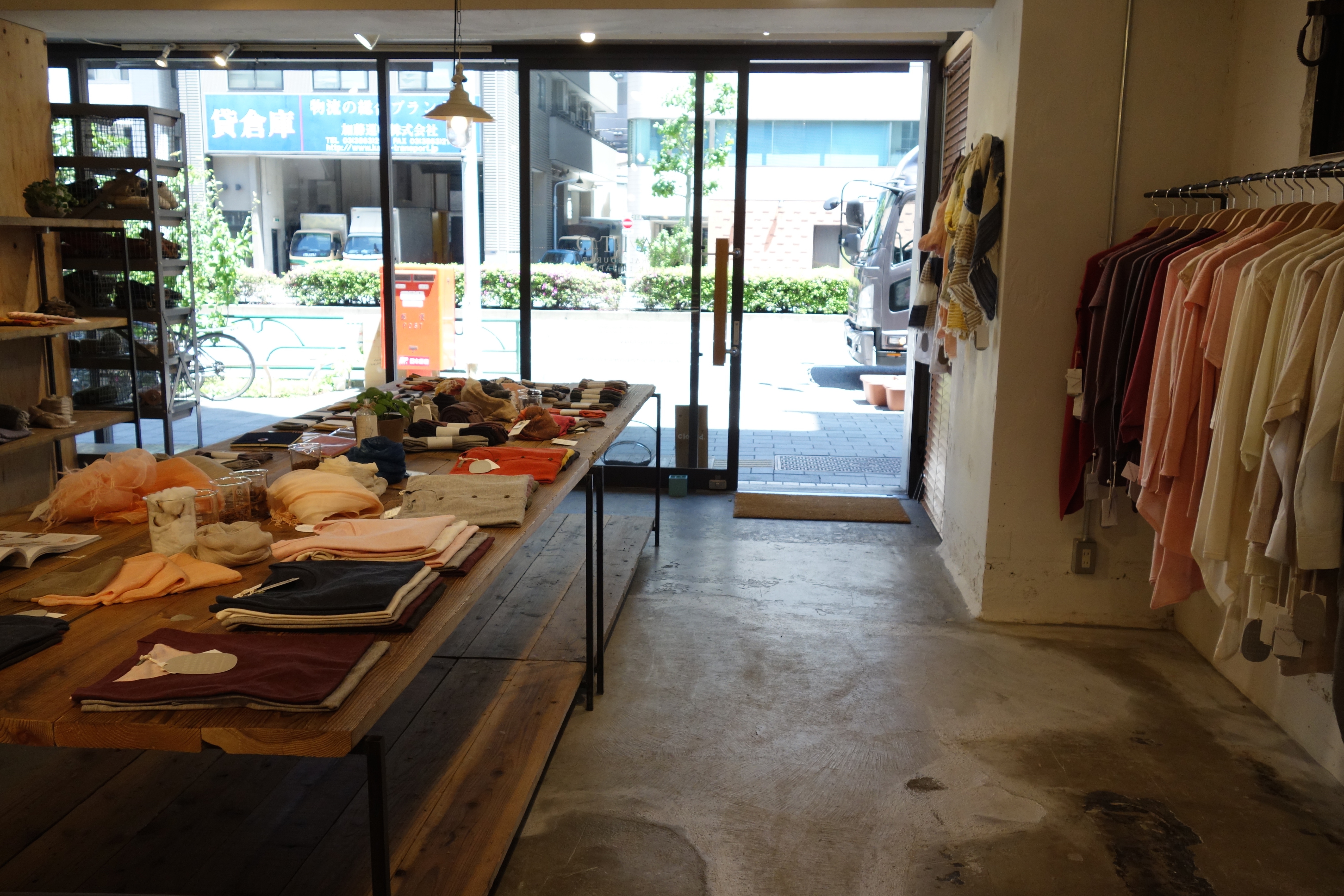 Maito Komuro makes magic. That’s how it seems, just like when someone first showed you photographic developing, a sort of wizardry. See, in this plastic bucket, in the workshop behind the showroom of his self-named store in Kuramae, behind his hanging racks and shelves of delicate natural-fibre clothes, see this purpleish blackish liquid. And here in this collander are some green branches he has boiled. It’s yomogi, he says, mugwort. And here is what happens – he unfolds a length of summery lemon-coloured cotton, which is what you get when you put white fabric in the blackish purple liquid, and then set it with a mineral – a mordant – such as calcium, copper, iron, or aluminium. He shows you some different coloured cottons, including a driftwood sort of beige, and bright yellow. All of them from the same purple mugwort solution, just with different mordants.