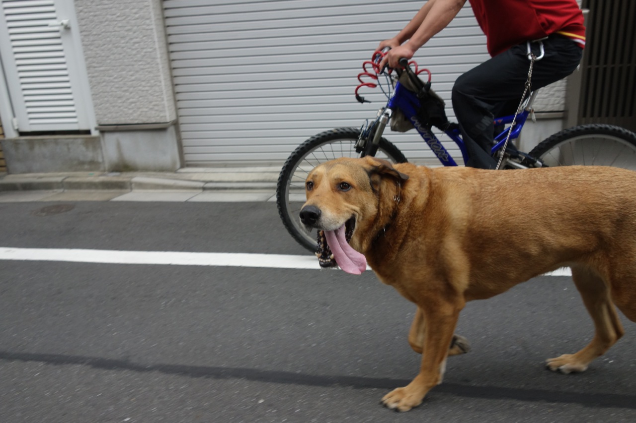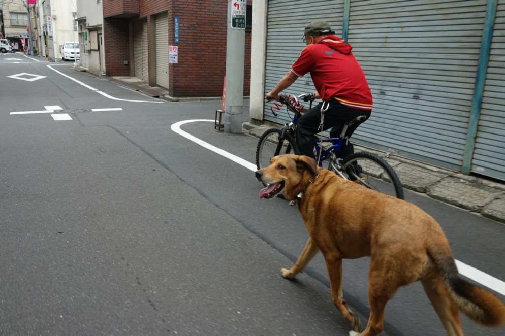 You glide up beside them this quiet afternoon at the back of Kappabashi. Hello, he says. What’s that? Yes, Rhodesian Ridgeback. We’re going for a walk. You want to walk him? He unclips the leash and offers it to you as you ride alongside. What a calm-looking dog. As long as that tongue keeps drinking the cool breeze, you feel dog and rider could go forever.