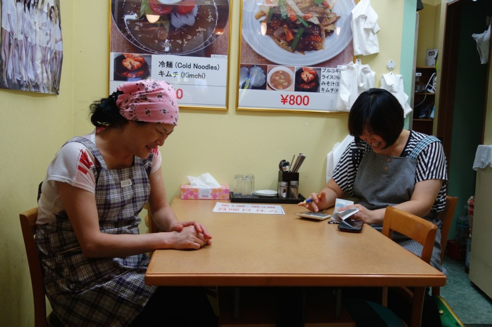 Ever-expressive Kim in her pink bandana leans over and vigorously takes you through the menu. She and little sister Koh started Good Friend last July after opening in December as a takeout. It’s one of those handmade places that just is. No professional designers, no service-industry posture. The seamless open front lets you be part of the crowd but not right in it, a passerby while standing still. The samgyetang medicinal chicken broth at 800-yen is the most calming thing you’ve eaten for days. Fall-apart chicken in a ginseng infused soup. It’s more than homecooking, it’s also like being at home, you don’t stand on ceremony, just tell them what you want, read your book, the sisters will give you refills of kimchi or rice, you help yourself to the water on your table. In the lull before closing they sit at the back table planning their new menu of nighttime drinking snacks. Koh tots up the day’s accounts. She says, Customers are increasing, but there’s not a lot of money in it, we are very cheap. Our Sundoubu tofu hotpot is only 680-yen, our bibimba is cheaper.