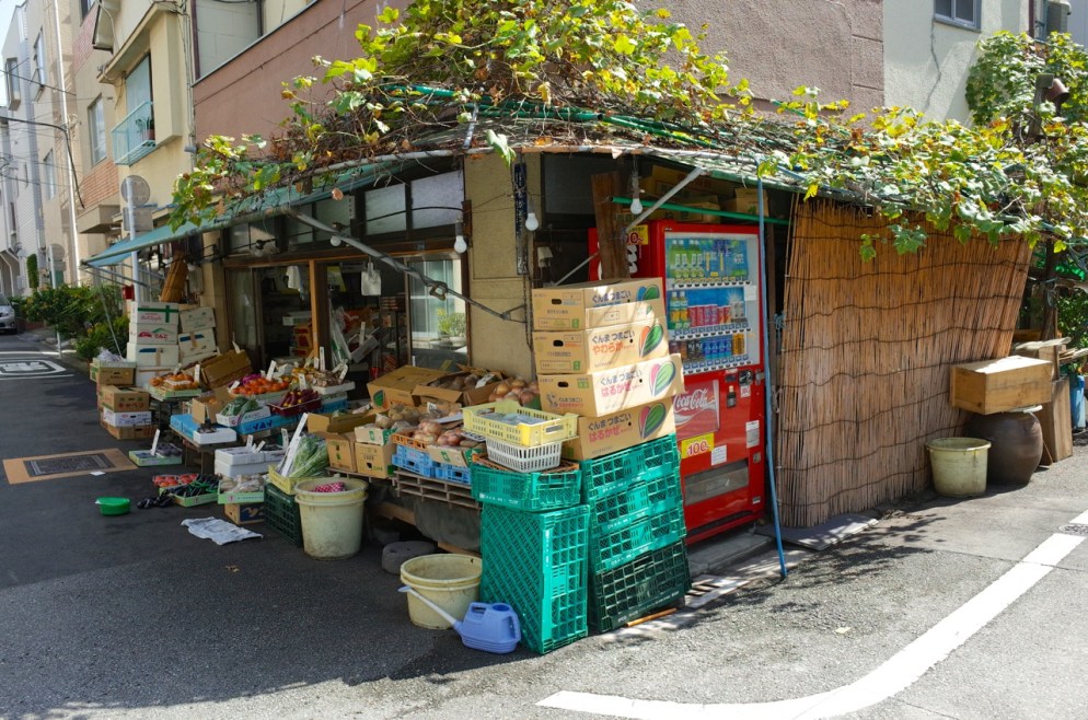 In midsummer the fruit and vegetable shop Ichikawa Seika seems to grow into the abundant vine as much as the vine seems to support the shop. Now the greenery has thinned, the seasons are changing. Mrs Ichikawa says, We’re getting persimmons and grapes. Soon lots of apples. She tapes together bundles of negi leeks in the cool shadows at the back. Fourteen, she calls out, when she is done, to Mr Ichikawa.