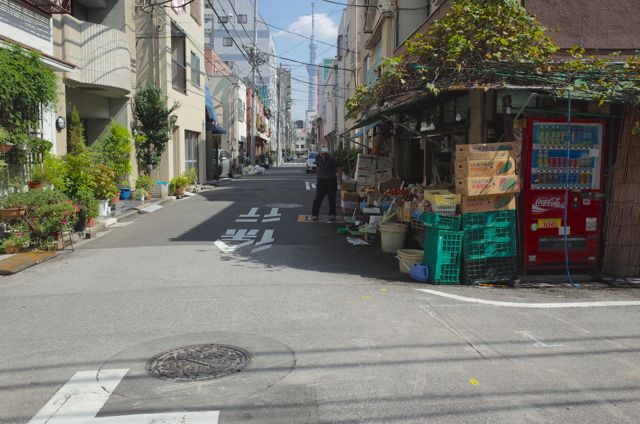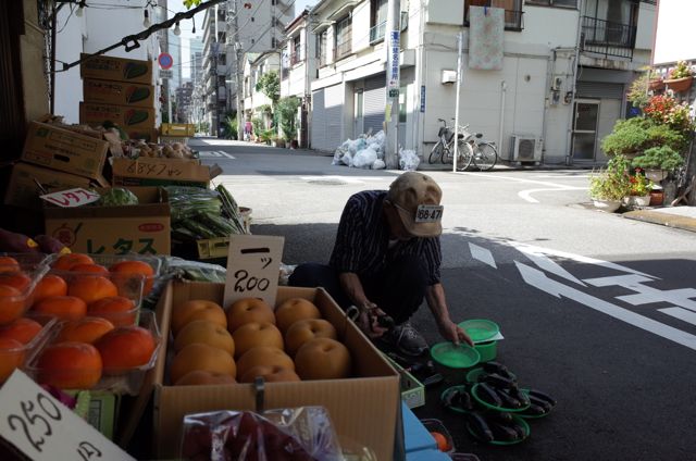 He squats on the street trimming the stems off eggplants so they look uniform. Customer service. You’ve seen him before, removing the knots and eyes from sweet potatoes. He says, My father started here in Meiji 43. That’s 1911. Gee is it a hundred years, he says.
