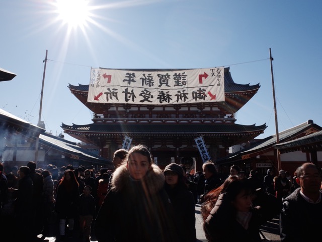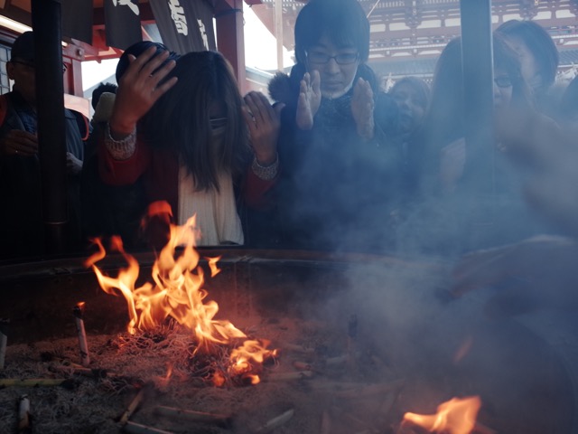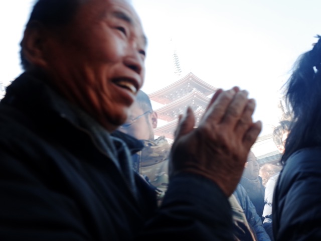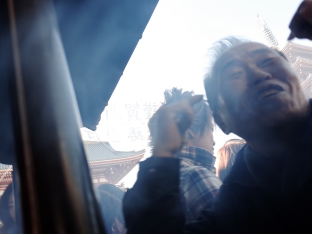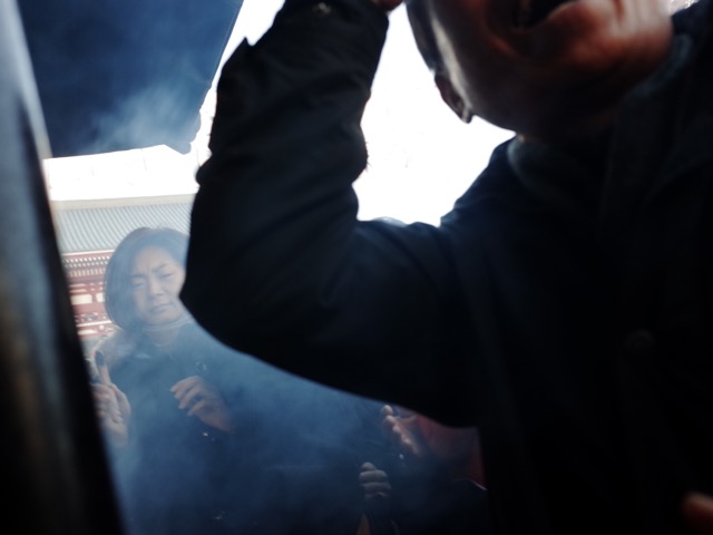 At Sensoji temple, the priests have shifted the incense cauldron to the side of the main approach, to make room for the New Year’s crowds. You waft the healing smoke over your afflicted parts, that’s the idea. Leave the rest to Kannon, Goddess of Mercy.