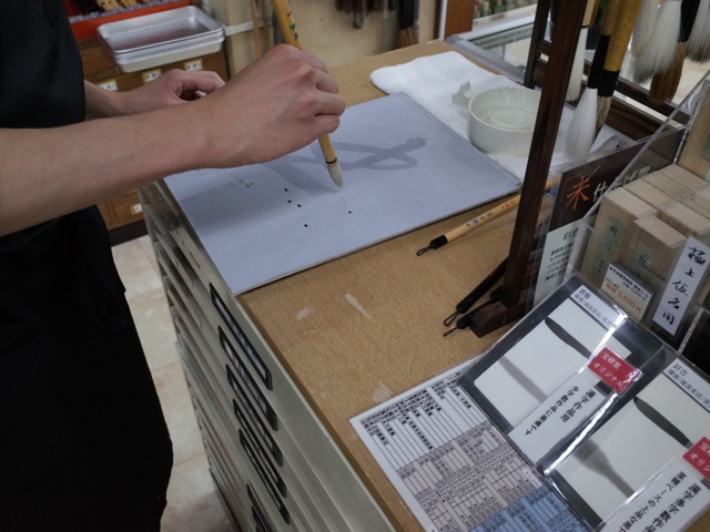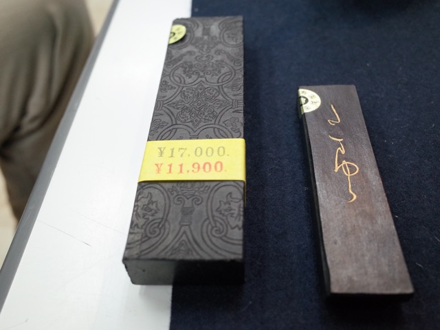 Young staff member Nobuharu Kure shows you the brushes and inkstones. Many are antique, all are Chinese, from Canton. A craftsman comes in some weekdays to work upstairs, repairing old stones.