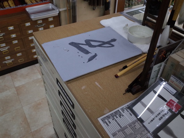 Like on this rainy-season afternoon in the backstreets of Kotobuki. A scholarly-looking Chinese fellow with his wife and kids is taking photos of the building, when you notice for the first time that it is a store selling ink, stones and other items for brush-writing, or shodo.
