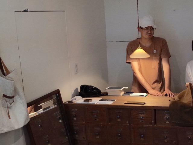 Well-worn fabrics of linen, cotton, hemp and silk, from Japan and France, are crafted by Yamanaka into gentle, easy-to-wear clothes including jackets, trousers and tops, as well as persimmon-dyed bags and pieces of simple unaltered boro, or painstakingly repaired cast-offs. They are displayed around the walls and a central table. There is an energetic air, as visitors crowd the room to touch and try on the items.