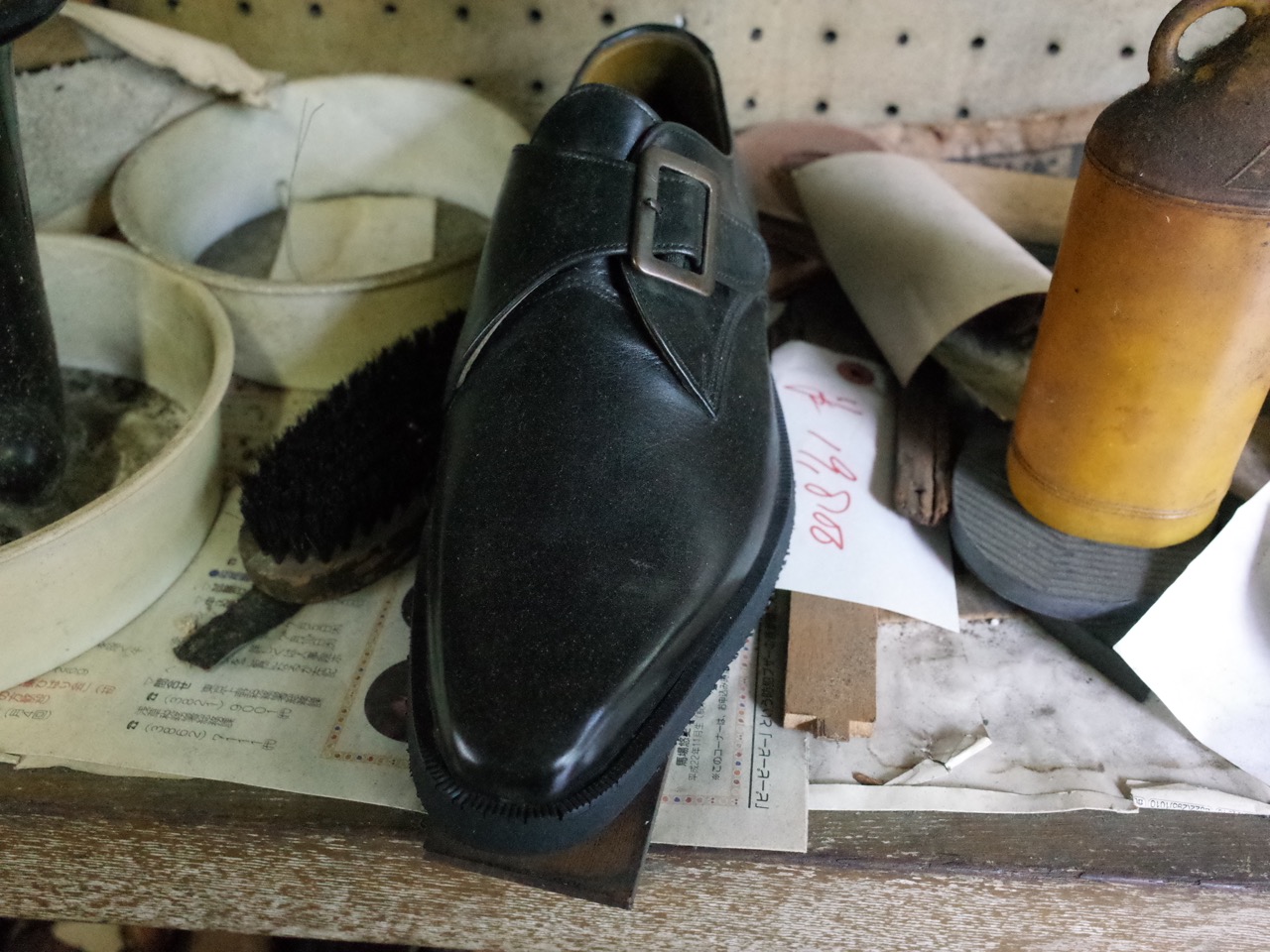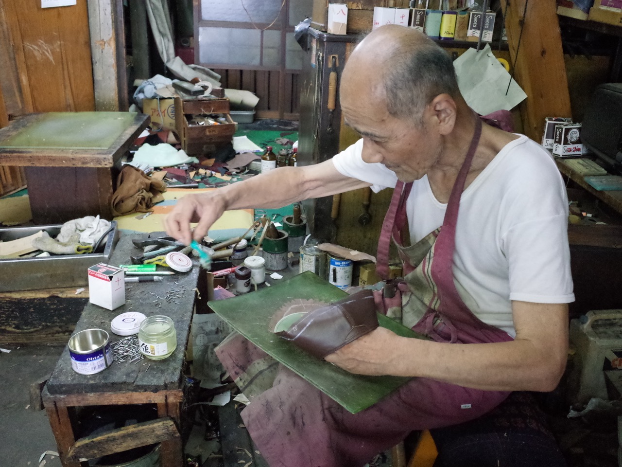 Shoemaker Masahiko Harada looks up through the open doorway against the daylight. He is glueing some leather. He wears an apron, a loose white T-shirt, and what appear to be two different shoes with one sock. And what seems like a permanent expression of surprise. Yes do come in, he says, Yes, try some on! You are interested in buying, aren’t you? He is not being pushy. He is making sure you’re not just mucking around.