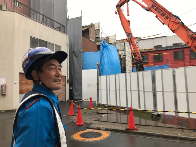 Did he know the place? The mosaics? I came here when I was 10, he says. We came down from Niigata. I don’t remember much. He seems to like the way the orange demolition machines are going about their work. One is like a bird, he says with arm gestures. It digs and digs. The other has pincers and grabs and twists stuff, like a crab!