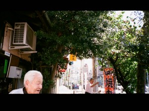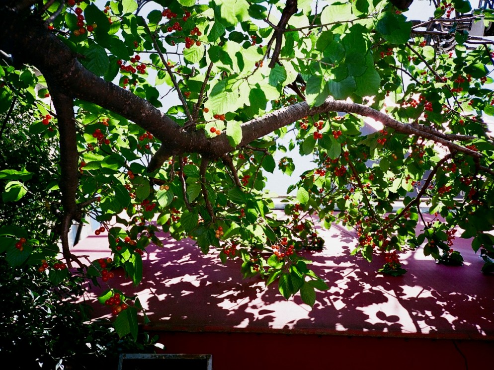 I’m taking snapshots of the cherry tree when suddenly a small man emerges from a sliding door behind me. He looks like he is off for an errand. He is quite old and a little unsteady on his feet. But he seems happy I am photographing the cherries. The restaurateur, who has also come onto the street, introduces him as the landlord. I had a vision of someone more possessive of his splendid tree, maybe even a bit cranky, but he says hello warmly and asks where I am from, etcetera, and shows a big smile with no teeth. He says, The cherries aren’t yet ripe but you must take some soon! Then he wobbles off.