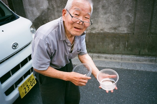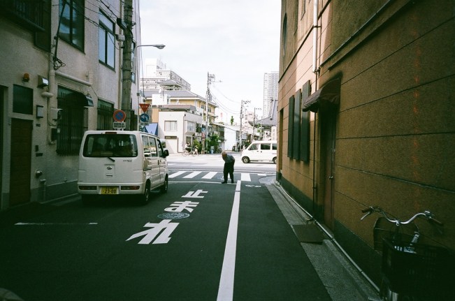I’m feeding him rice and he’s eating it! said the man. I asked, What will you do with him? He said, I will keep him until he dies. He spoke very fast with a countryside accent that jumped as much as his train of thought. He was at the same time keen to talk and anxious to leave. Suddenly he jumped back in his van, started the engine and drove off, only to stop further up the street near the corner of Asakusa-dori opposite Higashi Honganji temple. He got out and took another postcard around the corner and by the time he came back to the van I had caught up.