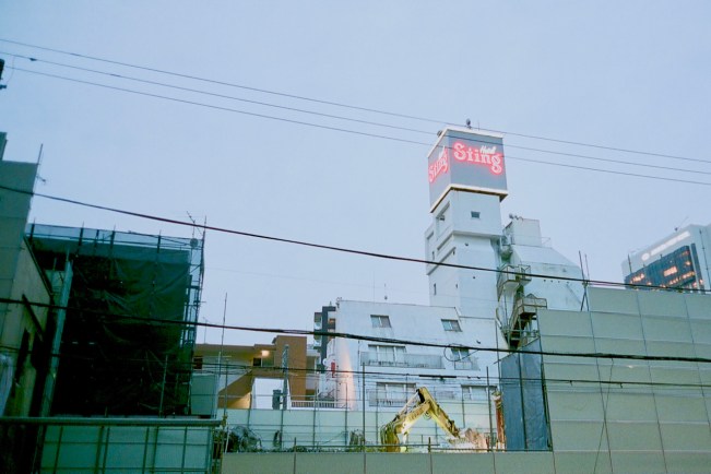 The good thing about the very tall structure that is bound to rise on this spot on Kototoi-dori, in place of the quaint “TV-set” style shops that stood here until getting killed off earlier this year, is that it will obscure the love hotel behind it and we won’t have to see the name “Sting” every time we pass.