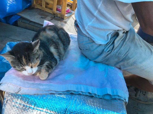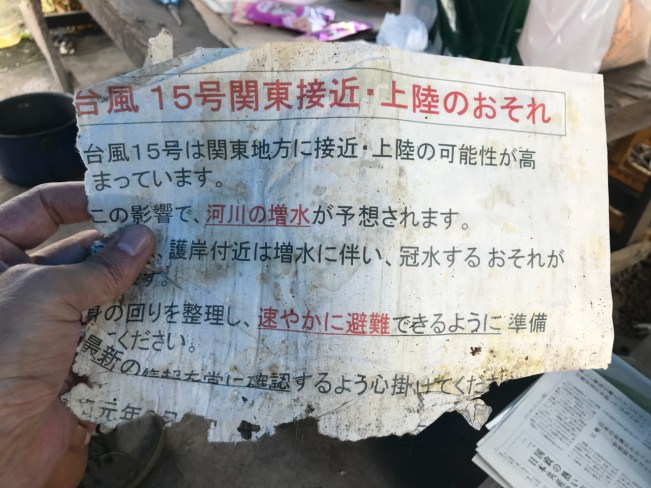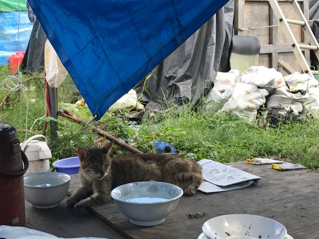 Up by the Arakawa one humid afternoon about a week after the terrible typhoon of September 9, I looked in on Mr Tanaka at his small compound of blue tarpaulin huts. We sat on boxes under a tarp among the summer weeds, at a low table of construction-site plywood scattered with utensils, a jar of instant coffee, a couple of cats, water in ramen bowls. There are five male cats, one named Sakura, another Mii-chan, who won’t move for his owner and takes a nap behind his bottom. There is also today’s edition of a major newspaper. Tanaka keeps up with events. He bends down and picks up a tattered typhoon warning showing the predicted course of the storm.