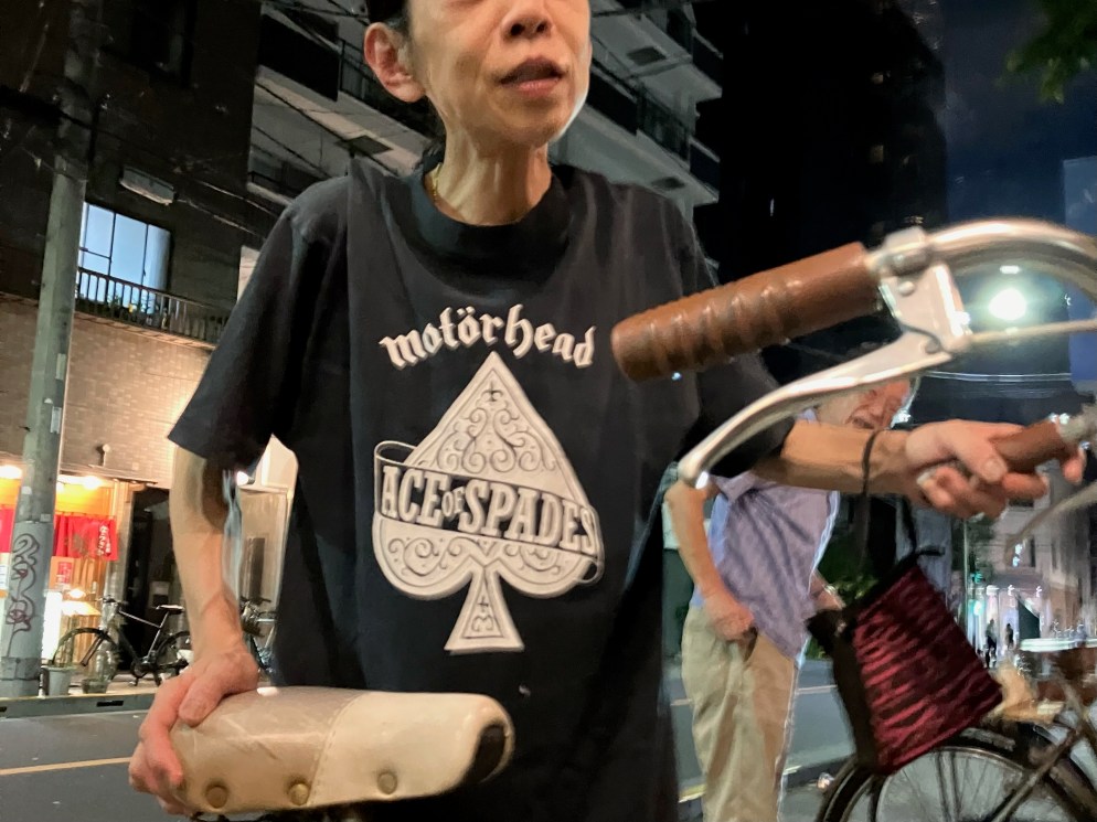 Autumn evening perfect temperature to dry off and drink a Coke outside Akebono-yu bath. The bicycle handlebar beside the bench makes a hook for my jacket until the owner comes out for her ride, apologises for disturbing me, and I say no the rudeness is mine, then she smiles and gestures to the bathhouse and I say yes I’ve been in and she says isn’t it a wonderful custom and where are you from etc., then I notice her T-shirt and say that’s a cool T-shirt and she says it’s an old one of my husband’s, he gave it to me as a present, you know, he likes jazz, and heavy metal.