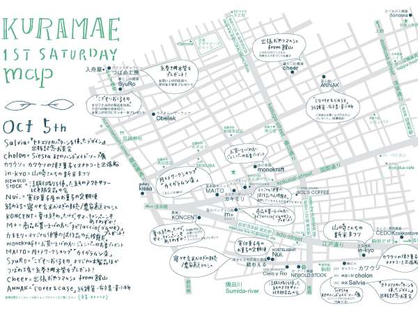 Down by the river and pockets west in Taito-ku this October 5 you will find First Saturday, the monthly event that is less a single happening than a sort of current or tide that connects people who make stuff in the places you see on this map. Fashion your flow, join your own dots. Pick…Read more